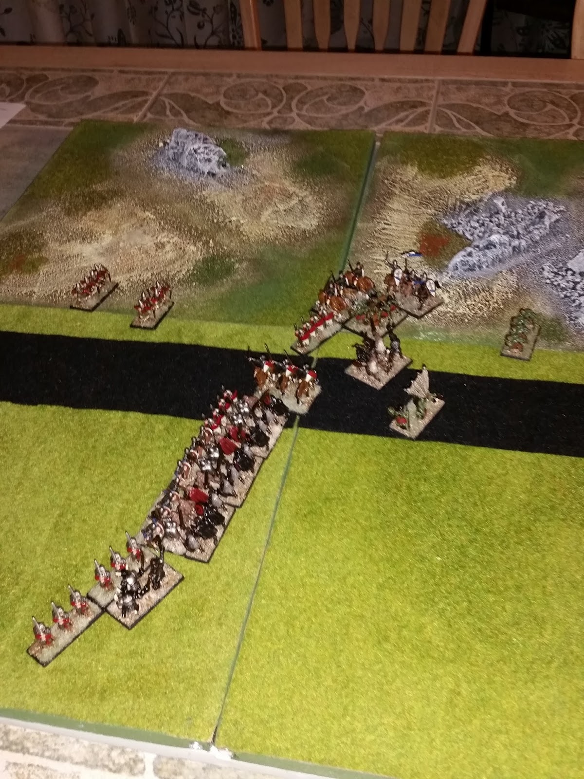 The human cavalry picked its way through the rough, while the infantry and orc hordes slowly maneuvered towards each other. The battle was finally joined when the cavalry got into some clear and smashed into the Orc hordes.The human blades faced off against the Orc warbands and quickly dispatched their foes.