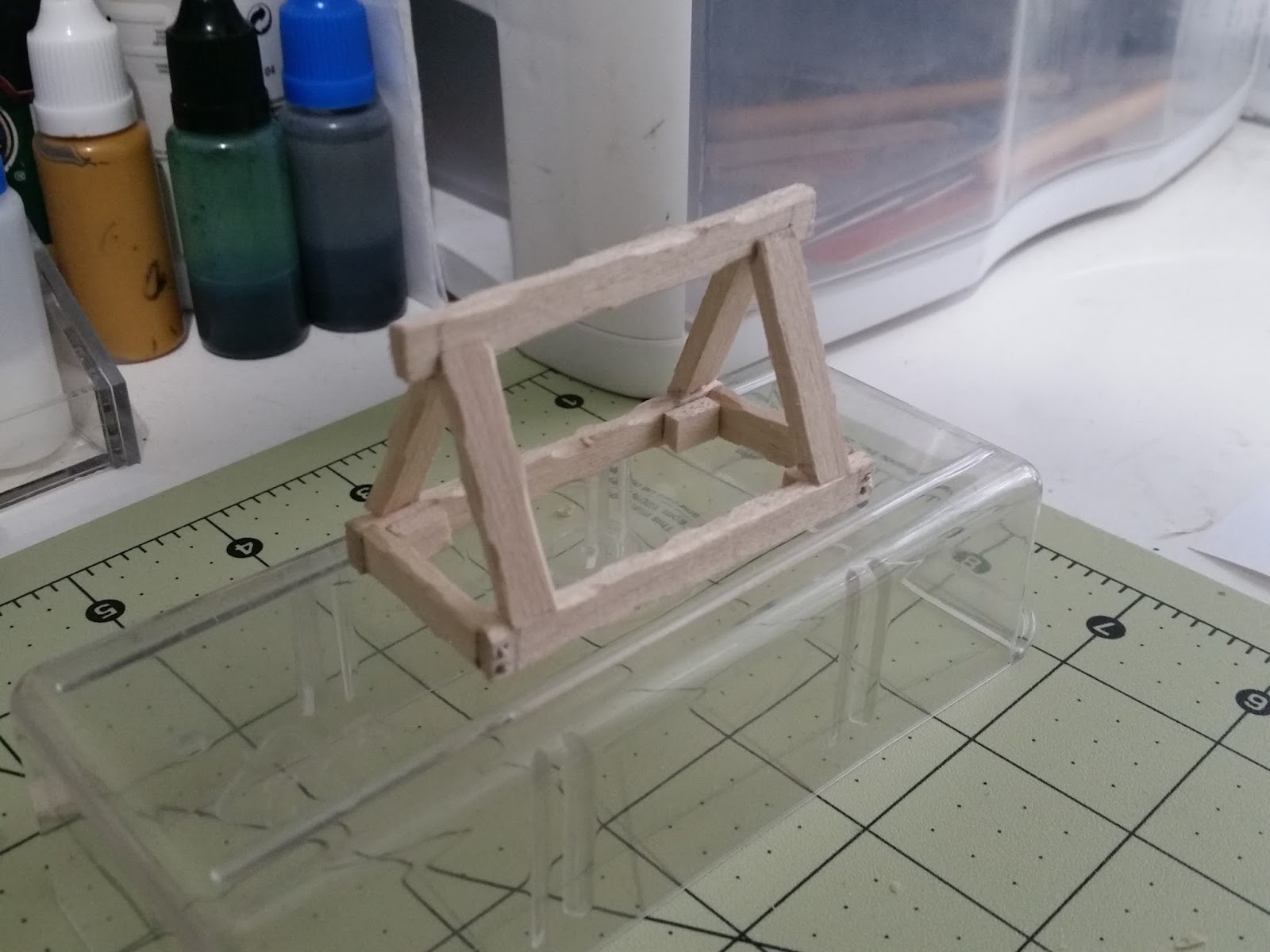 To start with, their dimensions were pretty huge! I’ve got a 25mm Ral Partha catapult and the Battleground’s ram would be almost twice that size. So I cut most of the measurements in half – 2.5″ x 1″ frame, 1.25″ legs on the A-frame, and so on.