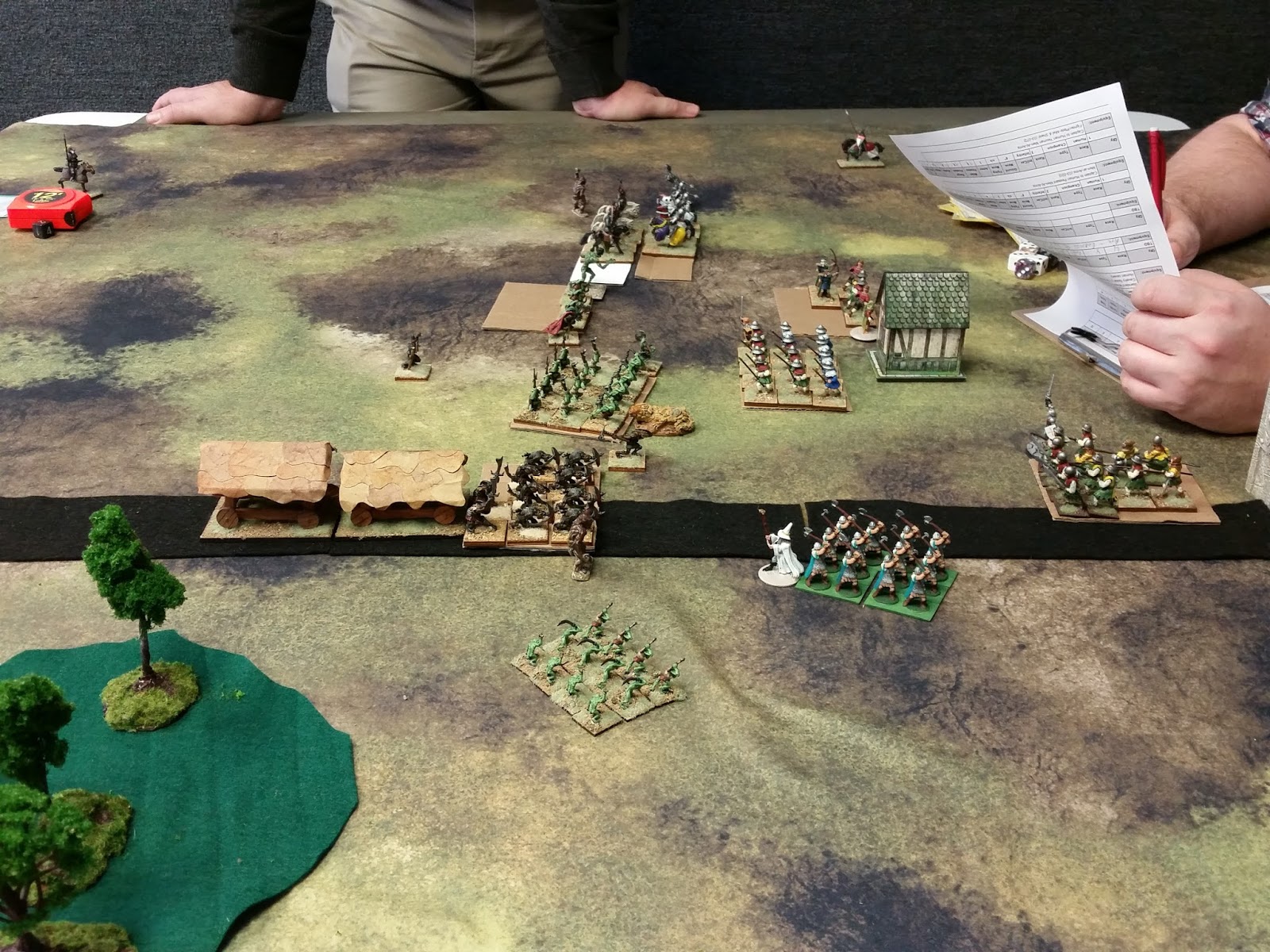 That look on Jacob’s face is the “Crap, why don’t the dice like me?!?” look. The forces of Weal and Woe clashed, magic spells flew, arrows and bolts flickered across the board and shields splintered as both sides fought hard.