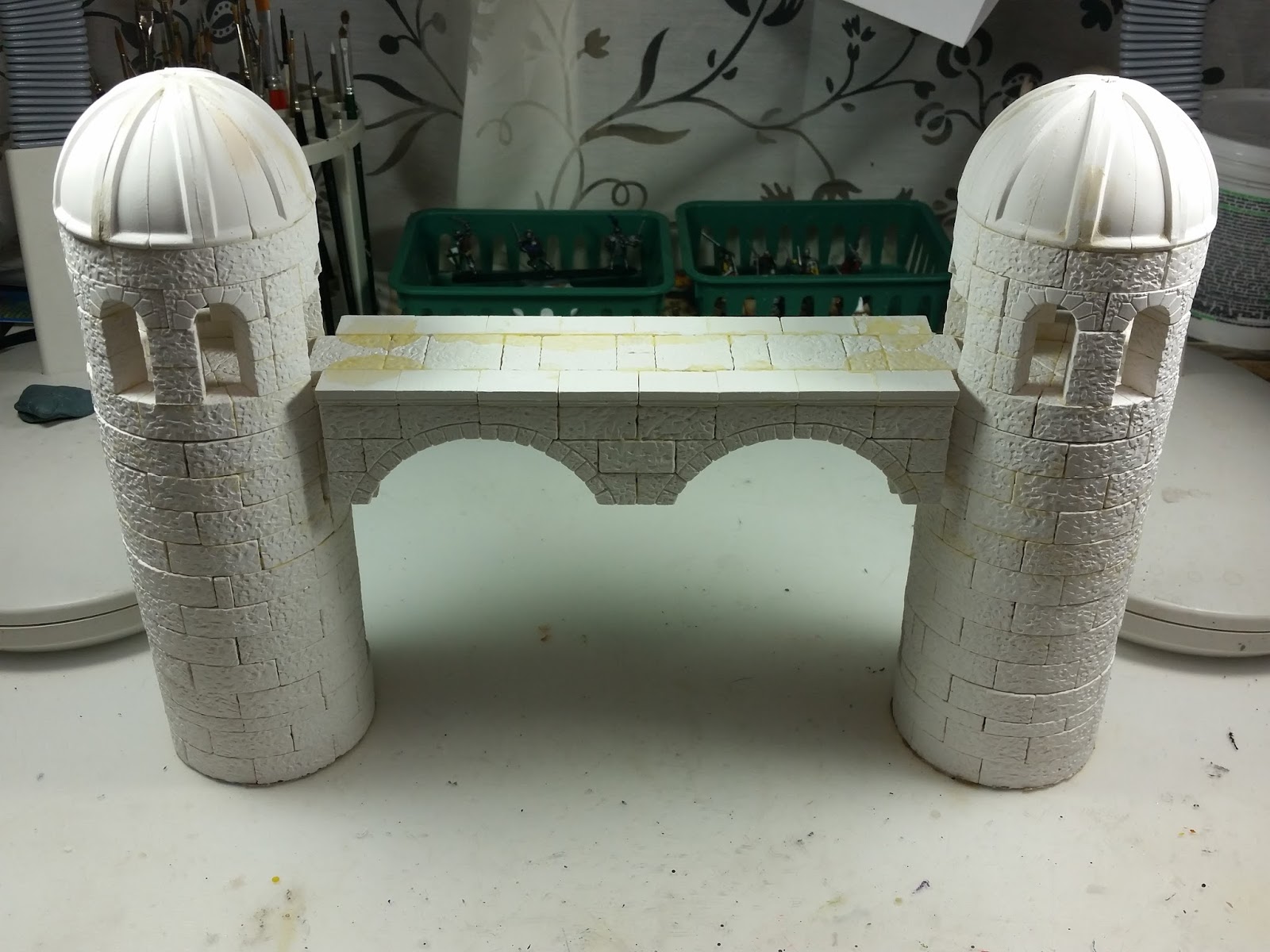 Here’s the WIP showing what the towers will look like with the bridge attached. This is a dry fit right now, I still need to put sides on the battlements and then paint the individual pieces. This is the view from the city side.