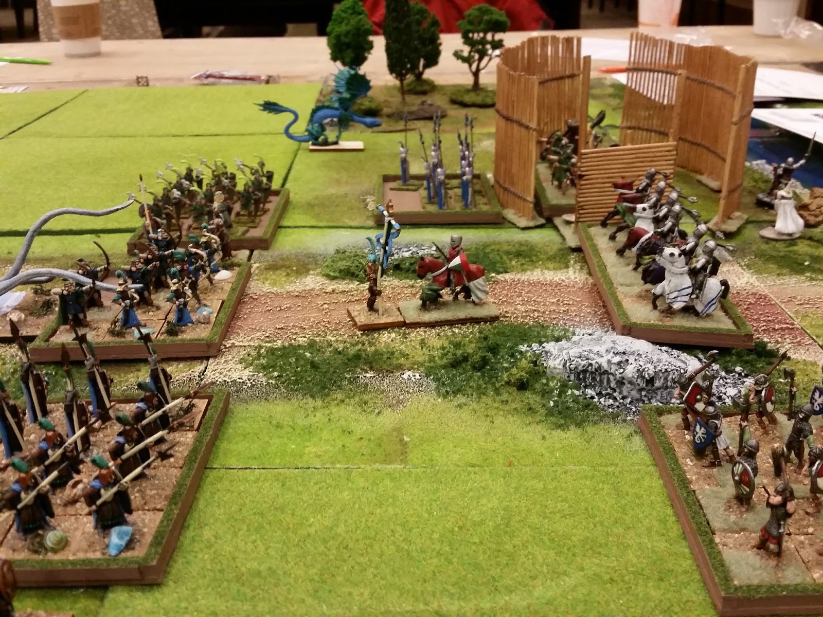 I felt bad for the human players. One of the players had so many bad rolls, he really started to get upset. It wasn’t until he pulled out dice that he hadn’t touched for a year that he begin to roll better! By then, though, the battle was mostly over and the humans had been severely mauled. It probably would have come down to whether the forces in the palisade could hold out and kill enough of Orenal’s troops.