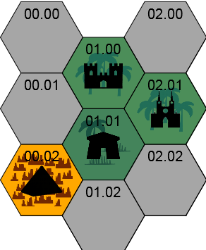 Homebase (Hex 0) (0101): Muddeskip – H A rough and dirty village of crude huts, a couple of long halls and even open lean-to’s, full of humans living in the equivalent of the Early Dark Ages. They are vassals of the nearby Orc Warlord (0100), with half-orc outcasts in charge of the villagers who work the rough land in exchange for “protection” and “leadership.” Despite the primitive nature of the humans, there are some goods available for “ugthun” (lumps of silver with the seal of an Orc Warlord) or service to the seller.