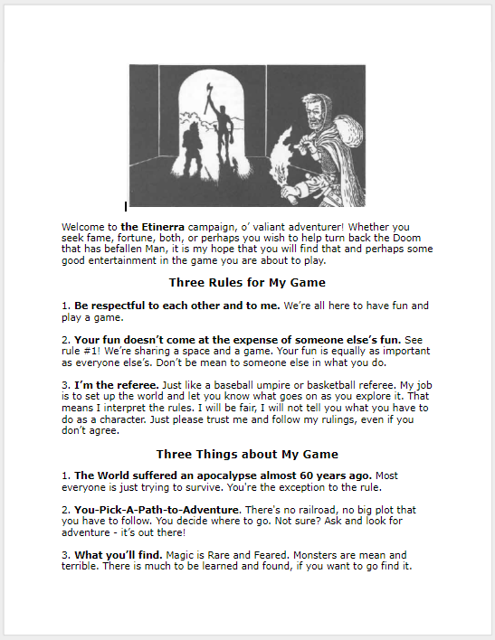 One Page Handout – I’ve used this pretty much as-is since I started the campaign. At its core, it tells the player the basics of what is going on, what to expect and (hopefully) a feel to the campaign – serious, but not TOO serious.
